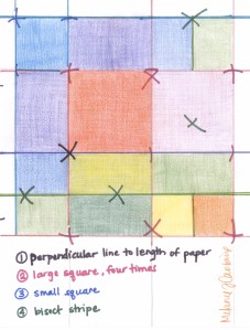 I let the kids do some problem solving and they developed a strategy that built on the skills they had previously developed. Using their strategy*, I set them on the task of creating either a four-panel comic strip or constructing a Mondrian square, modeled on the geometric art work of Piet Mondrian. This easily took two 40-minute class sessions, especially with coloring the final products and some students completing both options. Considering my open-ended directions, I thought the students still did a very nice job.