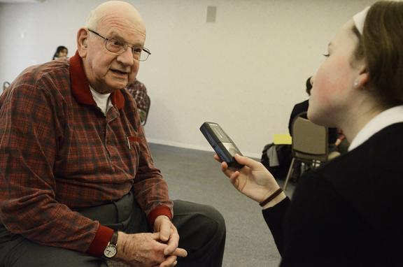 Saratoga Central Catholic 8th grader Jessica Matthews interviewed WWII Veteran Jack Robertson at Prestwick Chase for his American History class’s Greatest Generation Project.Photo Erica Miller 4/18/13 news_Generation2_Fri