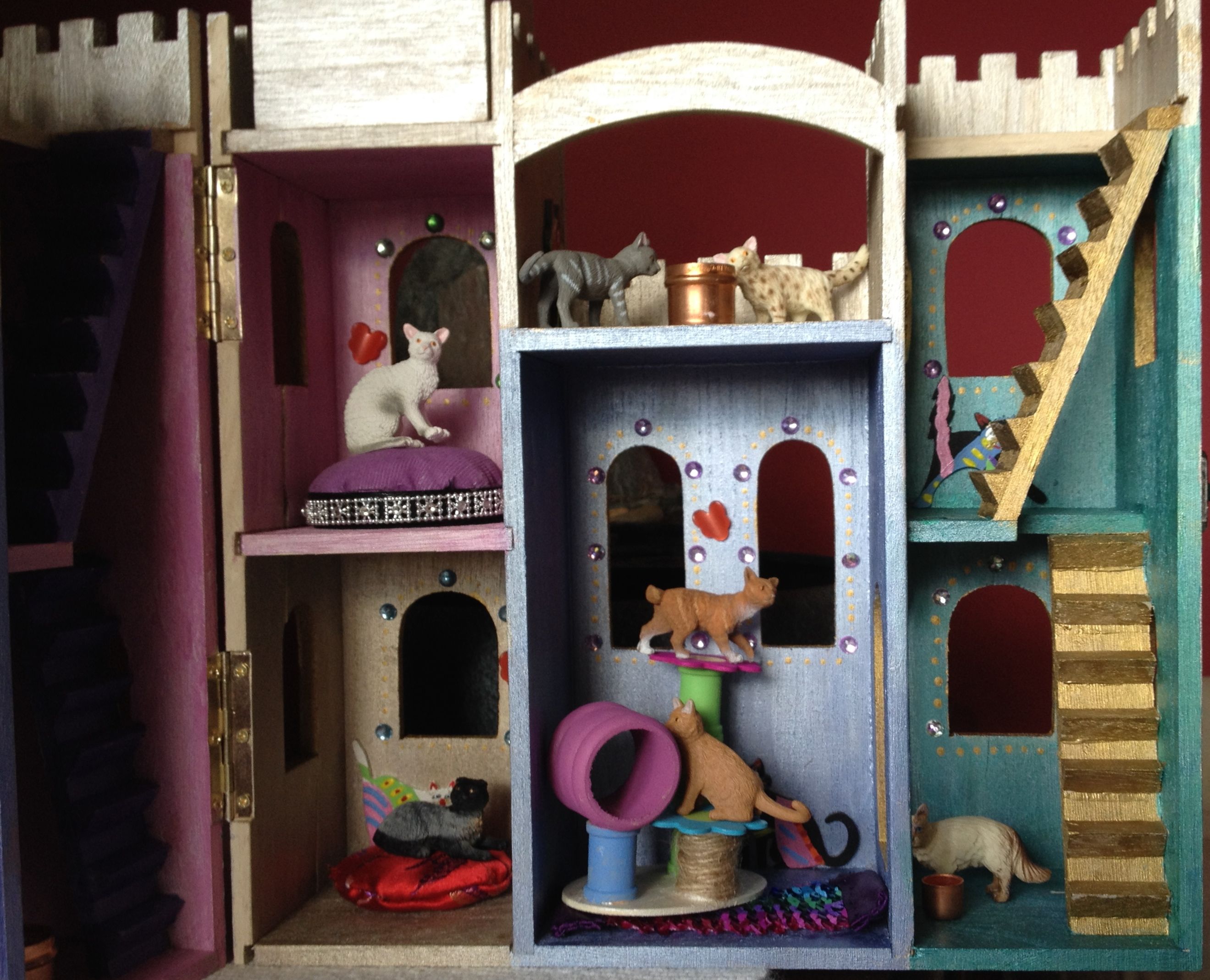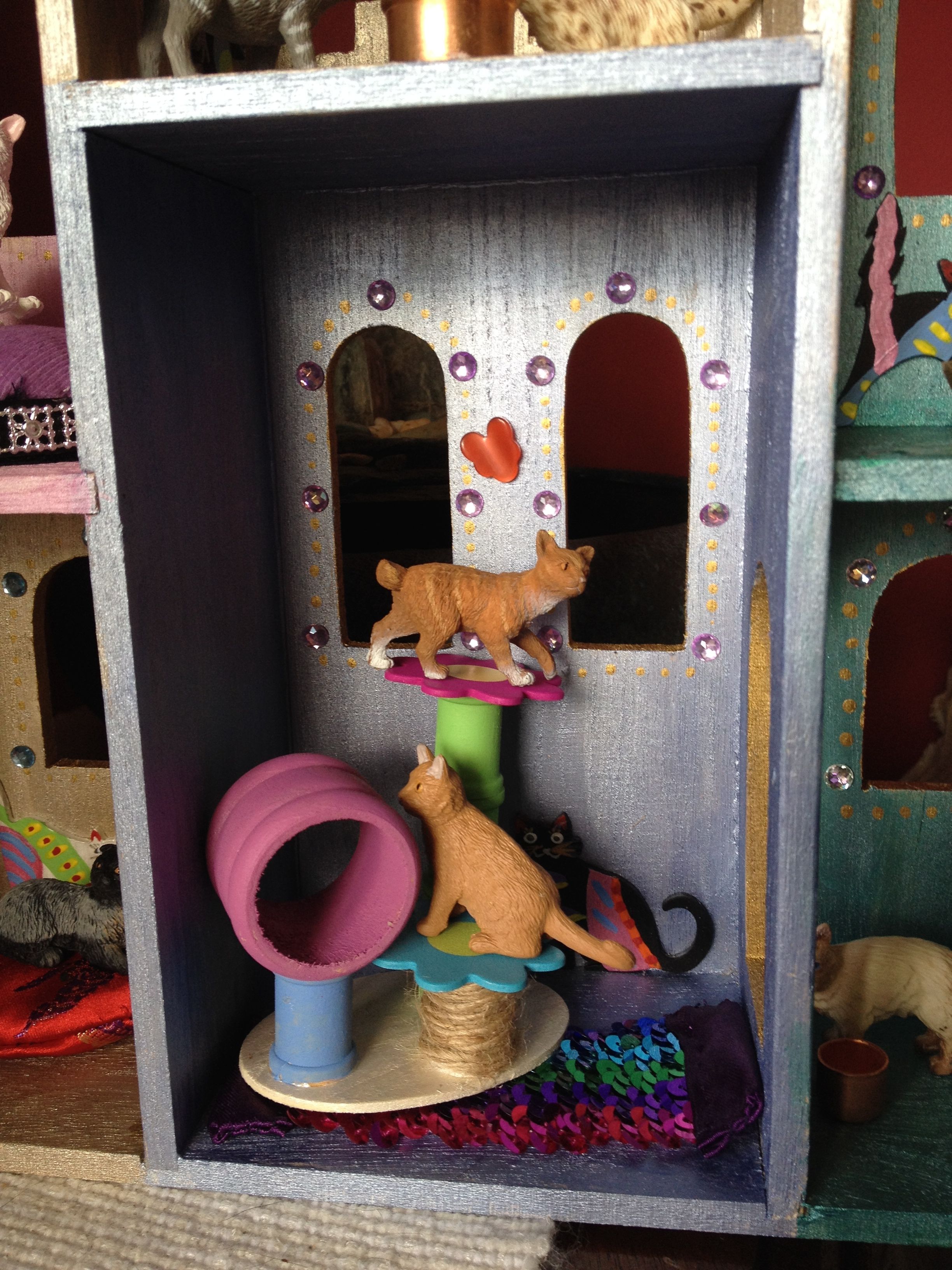 Recently, another friend and I built a cat castle. Really. It started as a plain wooden castle I thought might be fun for some of my favorite children. But as my friend and I talked and laughed, and I painted, somehow our joint love of cats and the joy of the moment brought the idea of a castle just for cats. Eventually the castle was decorated with multicolor rooms and bejeweled windows (it is a castle, after all!). And then it needed furniture. What would cats have in a castle? Velour cat beds made from peanut butter lids, no doubt, shiny bowls made from plumbing pieces, and a hand-crafted miniature cat tree.