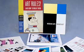 The kit Art Rules (And How to Break Them) can help. The kit is subtitled “How to Think Like a Modern Artist,” but it will help you (and your family or your students) do more than just think. There is a booklet introducing basic information on principles underlying contemporary art, but the heart of the kit is the cards. There are seven sets of six cards, each containing a master card and five game cards. Each master card describes the general ideas behind the works in the set. The game cards introduce other works in the genre and give you strategies to create art of your own.