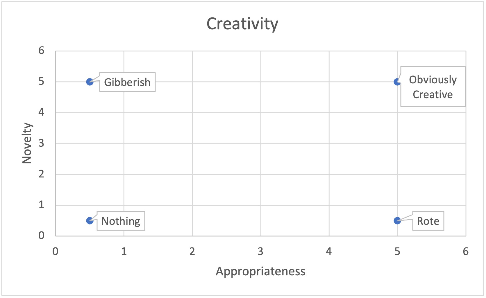 Most definitions of creativity focus on two dimensions: novelty and appropriateness. For something to be considered creative, it must be new and original. It also must be appropriate to some goal. Random novelty, like the infamous primates pounding on keyboards without intention, is not considered creativity. Kaufman and Glăveanu take this idea one step further. Imagine a graph in which the axis at the bottom represents appropriateness, and the vertical axis represents novelty. At the top right, where something is both novel and appropriate, creativity can be obvious. At the bottom left, when something is neither novel nor appropriate, there is nothing, or at least nothing of interest. Highly novel but not at all appropriate can result in gibberish—my cats walking across the keyboard, for example, while appropriate but not at all novel, they labeled rote. But of particular interest to Kaufman and Glăveanu is the large space in the middle of the chart, the space they propose for Shadow Creativity.